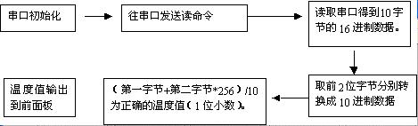 本程序的圖形代碼窗口如圖4.1和4.2。在圖形代碼窗口,為了完成對(duì)串口的初始化、寫和讀,分別用到串口初始化函數(shù)(VISA Configure Serial Port)、串口寫函數(shù)(VISA Write)和串口讀函數(shù)(VISA Read)。另外,由于得到的數(shù)據(jù)為16進(jìn)制,還用到了一些字節(jié)處理函數(shù),使之換算成10進(jìn)制顯示在程序前面板。