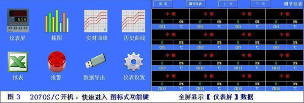 AIMINI-DCS超小型集散溫濕度監(jiān)控系統(tǒng)的操作方式:軟件界面有固定的觸摸按鍵點(diǎn)【開始】出現(xiàn)目錄條顯示【數(shù)據(jù)】【流量數(shù)據(jù)】【實(shí)時(shí)曲線】、【棒圖】、【實(shí)時(shí)多曲線】、【歷史曲線】、【流程圖】【歷史報(bào)表】、【報(bào)警報(bào)表】【儀表設(shè)置】【記錄設(shè)置】【前頁】【后頁】【手動(dòng)/自動(dòng)】翻頁、【參數(shù)設(shè)置】【程序設(shè)置】;控制程序的【啟動(dòng)】【暫?!俊就V埂康裙潭ǖ牟僮鞣椒ā?br/> AIMINI-DCS超小型集散溫濕度監(jiān)控系統(tǒng)采用盤面安裝方式, AI儀表采用盤面或?qū)к壈惭b方式;通訊線采用【超5類屏蔽雙絞線】,安裝24VDC開關(guān)電源。開機(jī)進(jìn)入圖標(biāo)式功能選擇畫面;【主頁】上顯示圖標(biāo)【調(diào)節(jié)儀表】、【流量儀表】【電量儀表】、【報(bào)警記錄】、【棒圖】、【流程圖】、【報(bào)表】、【數(shù)據(jù)導(dǎo)出】、【單條曲線】【實(shí)時(shí)曲線】、【歷史曲線】、【設(shè)置】、點(diǎn)擊進(jìn)入該功能畫面;