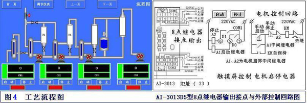 在流程圖中可操作按鈕;控制按鈕連接AI-3013D5開關(guān)量8路繼電器輸出模塊,地址設(shè)33號,圖中開關(guān)按鈕可控制4臺(tái)電機(jī)啟停;連接AI-3011D5開關(guān)量8個(gè)輸入干接點(diǎn),地址37號,顯示設(shè)備運(yùn)行狀態(tài);點(diǎn)擊圖中的數(shù)據(jù)框:【TIC-101】回到【單條曲線】通道。