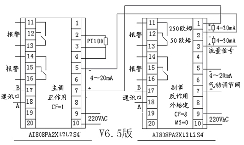 正確接線(xiàn)(圖二),注意信號(hào)方向,設(shè)置參數(shù):副調(diào):AI-808AXL2、流量量程標(biāo)度1.60T/h、設(shè)定值0.80T/h(系統(tǒng)正常運(yùn)行時(shí)的流量值)。dF=2、Ctrl=1、Ct1=1、Sn=32、dIP=2、dIL=0、dIH=1.60T/h、OPI=4、CF=8(反作用、外給定功能)、dL=2、可設(shè)置正、負(fù)偏差報(bào)警。主調(diào):AI-808AXL2、傳感器熱電阻,設(shè)定值40℃、Ctrl=1,dF=0.2、Ct1=4、Sn=21、dIP=1、OPI=4、CF=1(正作用)、dL=2、可設(shè)置上、下限報(bào)警、正、負(fù)偏差報(bào)警。(圖二)