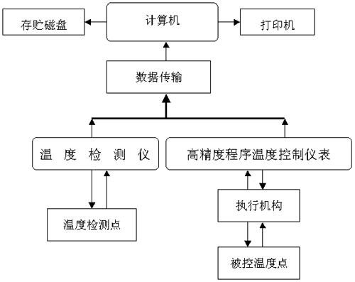 為達(dá)到上述生產(chǎn)工藝要求,系統(tǒng)采用各控制點分別采用單點高精度控制器進(jìn)行單獨(dú)控制,各參數(shù)點分別采用單獨(dú)的數(shù)據(jù)采集設(shè)備進(jìn)行單獨(dú)采集,將所有數(shù)據(jù)傳送至中心計算機(jī)進(jìn)行集中顯示、分析和處理。系統(tǒng)結(jié)構(gòu)如圖所示: