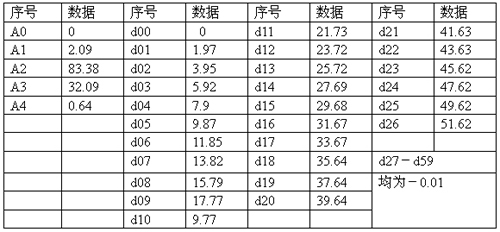 輸入:PTI00鉑電阻顯示二位小數(shù),采用自定義輸入規(guī)格Sn=10根據(jù)法執(zhí): 計算A01=1×1+0×8+1×16+3×64=209,A02=8333 A03=3209 A04=6418 d00 d01等參數(shù),采用表格輸出值就是顯示值如下:將表格內(nèi)參數(shù)輸入儀表。