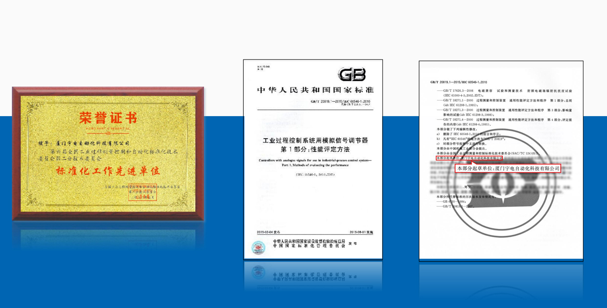 宇電積極參與國家標準制定工作,主持起草了《GB/T 20819.1-2015 工業(yè)過程控制系統(tǒng)模擬信號調(diào)節(jié)器》標準,該標準為溫控器調(diào)節(jié)器最主要的國家標準;并參與《溫度測量設備電子數(shù)據(jù)交換用屬性列表》等50多項國家標準制定。