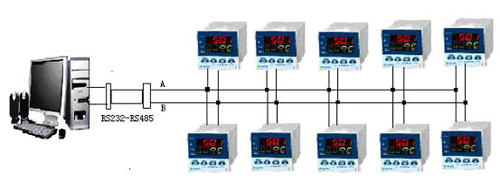 使用RS232-RS485轉(zhuǎn)換器可以很方便的連接計(jì)算機(jī)和10臺(tái)AI-501。具體方案如圖1。RS232-RS485轉(zhuǎn)換器的RS232端接到計(jì)算機(jī),所有儀表并聯(lián)在RS485的A、B端,并設(shè)置不同的地址。我設(shè)置的10臺(tái)AI-501地址分別是:1,2,3,4,5,6,7,8,9,10。