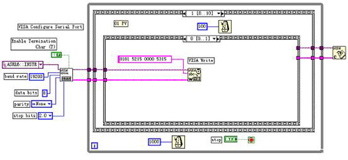 本程序的圖形代碼窗口如圖4.1和4.2。在圖形代碼窗口,為了完成對(duì)串口的初始化、寫和讀,分別用到串口初始化函數(shù)(VISA Configure Serial Port)、串口寫函數(shù)(VISA Write)和串口讀函數(shù)(VISA Read)。另外,由于得到的數(shù)據(jù)為16進(jìn)制,還用到了一些字節(jié)處理函數(shù),使之換算成10進(jìn)制顯示在程序前面板。