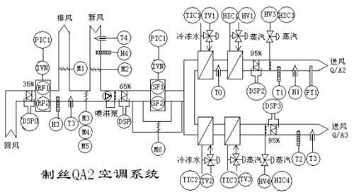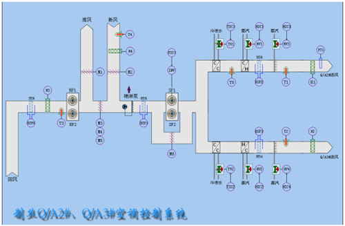 在上位監(jiān)控微機上顯示中央空調(diào)的整個工作狀態(tài),如工藝流程圖、動畫構(gòu)件、空氣流動塊、過程參數(shù)、安紐設(shè)置。