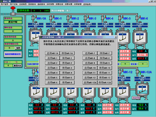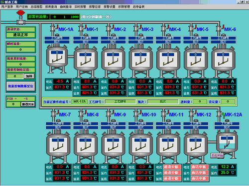 整個系統(tǒng)主要由一臺AI-708H控制14個反應(yīng)釜的批量進(jìn)料,分別由7臺AI-704M和7臺AI-501精確測量反應(yīng)釜的溫度和電機的電流,所有這些都在主控PC上進(jìn)行控制和顯示,并由軟件記錄并保存數(shù)據(jù)。