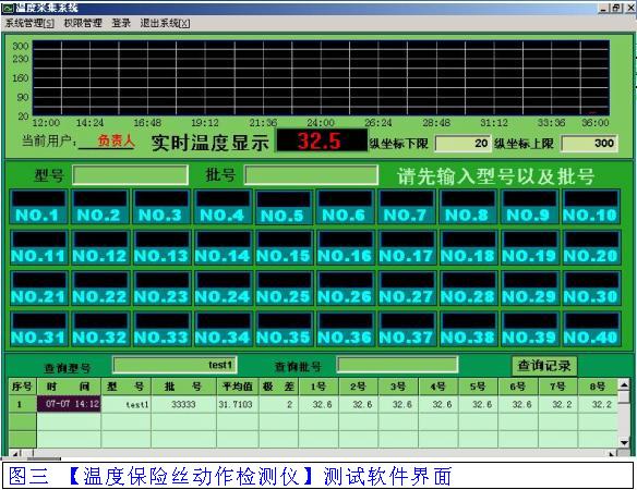 在加熱油鍋內(nèi)放置40個(gè)溫度開關(guān),鍋內(nèi)的溫度從50℃向300℃不斷升溫1℃/分鐘,當(dāng)溫度開關(guān)斷開時(shí)記錄每個(gè)斷點(diǎn)的溫度。在軟件輸入產(chǎn)品型號(hào)、批號(hào)可查詢記錄,程序控溫結(jié)束及時(shí)計(jì)算區(qū)分出產(chǎn)品的合格與不合格品。